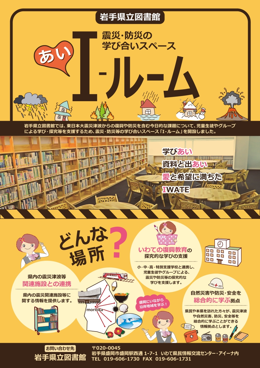 ここで、復興・防災教育などをテーマとする展示や豊富な参考資料に出会い、地域課題の解決に有益な情報(information)や進むべき方向性を示す指標・指針(index)を得る場と、愛と希望に満ちた岩手県(Iwate Prefecture)の創造につながる拠点となるよう、さまざまな『あい』を集め、「I-ルーム」と名付けました。