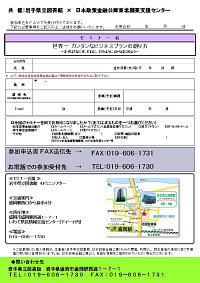ファックスによるお申し込みも受け付けています。申し込み用紙に必要事項を記入のうえ、ファックス番号:019-606-1731まで送信してください。