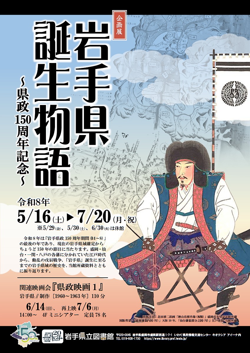 令和8年は「岩手県政150周年期間(R4~R8)」の最後の年であり、現在の岩手県域確定からちょうど150年の節目に当たります。盛岡・仙台・一関・八戸の各藩に分かれていた江戸時代から、動乱の戊辰戦争、「岩手県」誕生に至るまでの岩手県域の歴史を、当館所蔵資料とともに振り返ります。